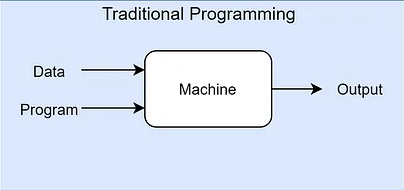 - Traditional programming languages typically take data and (business or solution) rules as input and apply the rules to the data in order to come up with answers as output.